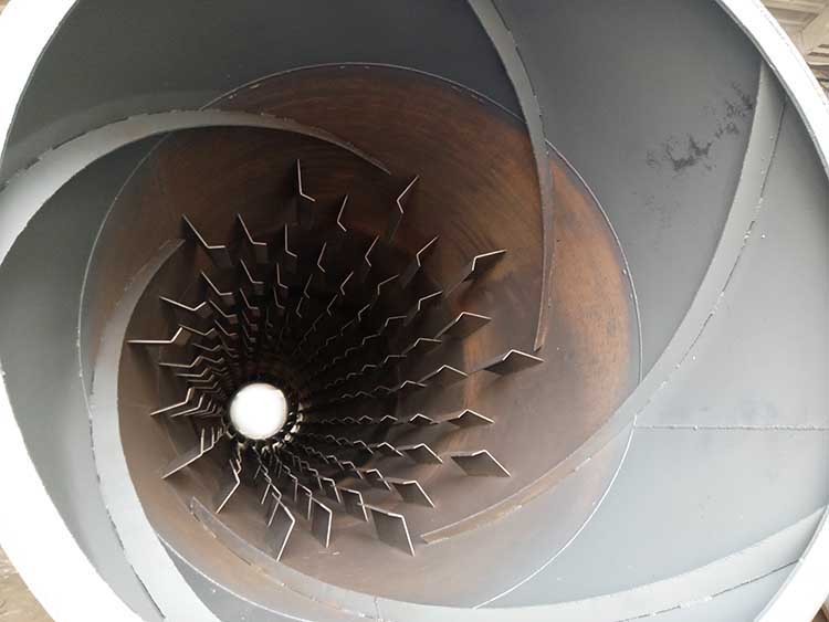 干燥的濕物料由皮帶輸送機或斗式提升機送到料斗,然后經料斗的加料機通過加料管道進入加料端。加料管道的斜度要大于物料的自然傾角,以便物料順利流入干燥器內。干燥器圓筒是一個與水平線略成傾斜的旋轉圓筒。物料從較高一端加入,載熱體由低端進入,與物料成逆流接觸,也有載熱體和物料一起并流進入筒體的。隨著圓筒的轉動物料受重力作用運行到較底的一端。濕物料在筒體內向前移動過程中,直接或間接得到了載熱體的給熱,使濕物料得以干燥,然后在出料端經皮帶機或螺旋輸送機送出。在筒體內壁上裝有抄板,它的作用是把物料抄起來又撒下,使物料與氣流的接觸表面增大,以提高干燥速率并促進物料前進。載熱體一般分為熱空氣、煙道氣等。載熱體經干燥器以后,一般需要旋風除塵器將氣體內所帶物料捕集下來。如需進一步減少尾氣含塵量,還應經過袋式除塵器或濕法除塵器后再放排放。