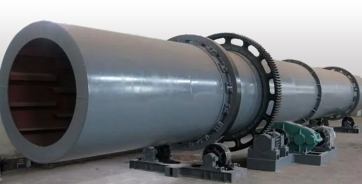 干燥的濕物料由皮帶輸送機或斗式提升機送到料斗,然后經料斗的加料機通過加料管道進入加料端。加料管道的斜度要大于物料的自然傾角,以便物料順利流入干燥器內。干燥器圓筒是一個與水平線略成傾斜的旋轉圓筒。物料從較高一端加入,載熱體由低端進入,與物料成逆流接觸,也有載熱體和物料一起并流進入筒體的。隨著圓筒的轉動物料受重力作用運行到較底的一端。濕物料在筒體內向前移動過程中,直接或間接得到了載熱體的給熱,使濕物料得以干燥,然后在出料端經皮帶機或螺旋輸送機送出。在筒體內壁上裝有抄板,它的作用是把物料抄起來又撒下,使物料與氣流的接觸表面增大,以提高干燥速率并促進物料前進。載熱體一般分為熱空氣、煙道氣等。載熱體經干燥器以后,一般需要旋風除塵器將氣體內所帶物料捕集下來。如需進一步減少尾氣含塵量,還應經過袋式除塵器或濕法除塵器后再放排放。